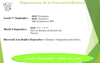 RENTREE DES ELEVES ET DES ETUDIANTS JEUDI 1er SEPTEMBRE 2022 8h Accueil des élèves de 1ère 9h30 Accueil des élèves de 3ème et de 2ndes ELEVES ACCOMPAGNES DES PARENTS Réunion des parents d'élèves de 3ème et de 2nde à l'issue [...]
